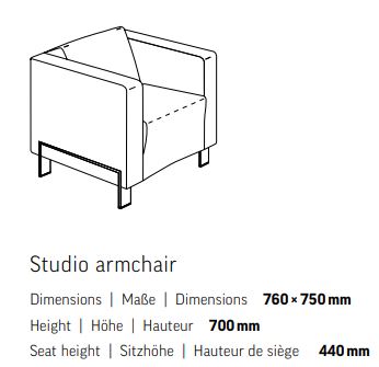 Η απλή γεωμετρική μορφή και οι ιδανικές αναλογίες επιτρέπουν στη σειρά Studio να εναρμονιστεί εύκολα με τους σύγχρονους εσωτερικούς χώρους αναμονής. Η γέμιση του καθίσματος και της πλάτης του καθίσματος εξασφαλίζει εξαιρετική άνεση και εγγυάται ότι τα έπιπλα θα μοιάζουν με νέα για πολλά χρόνια. Μια σειρά επίπλων που χαρακτηρίζεται από την εκλεπτυσμένη μορφή της. Η γραμμή περιλαμβάνει πολυθρόνα, καναπέ 2 θέσεων και καναπέ 3 θέσεων.