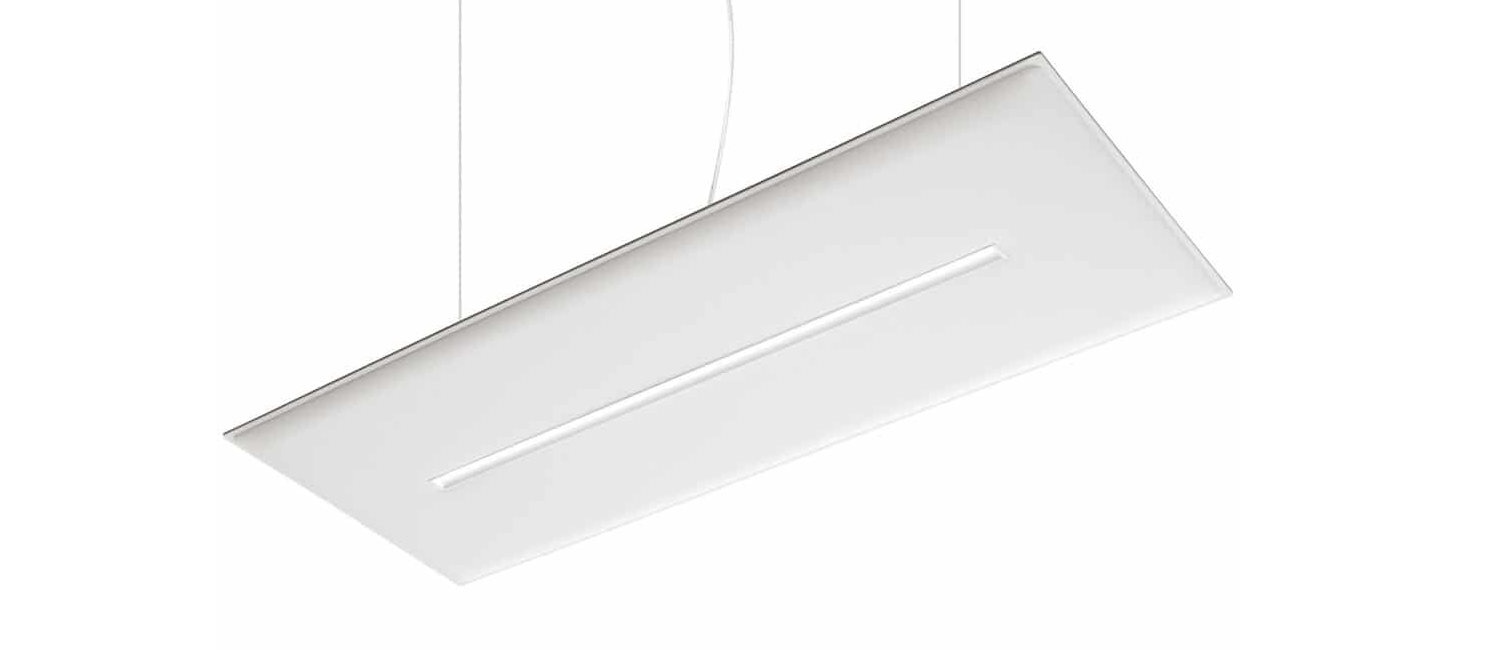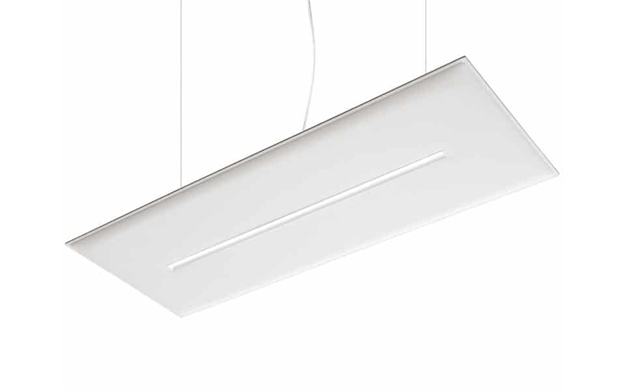 T-System Track is a sound-absorbing lamp made with Snowsound Technology panel and a 48V electrified track (with remote driver) that can hold aluminium luminaires containing LED. The system is suspended from the ceiling by means of two height-adjusting cable.