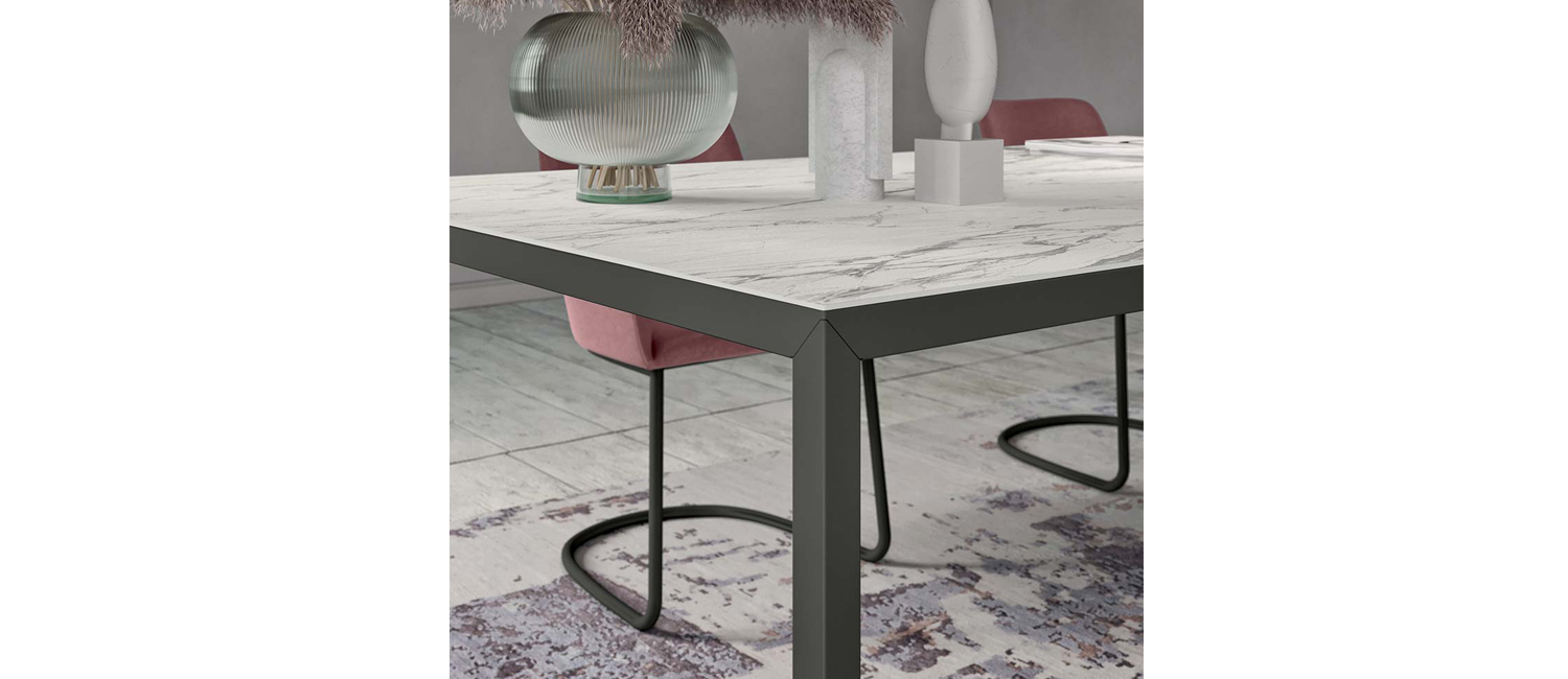 The collection is unique every time, thanks to customized fine finishings, like porcelain stoneware, which emphasize the understated metal sheet legs.