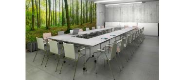 The Flib family of mobile, folding conference tables consists of tables available in 5 different shapes, as well as 2 tabletops serving as connectors for 90 degree angles. The quick enlargement of conference space is possible thanks to the combination of rectangular and oval tabletops.