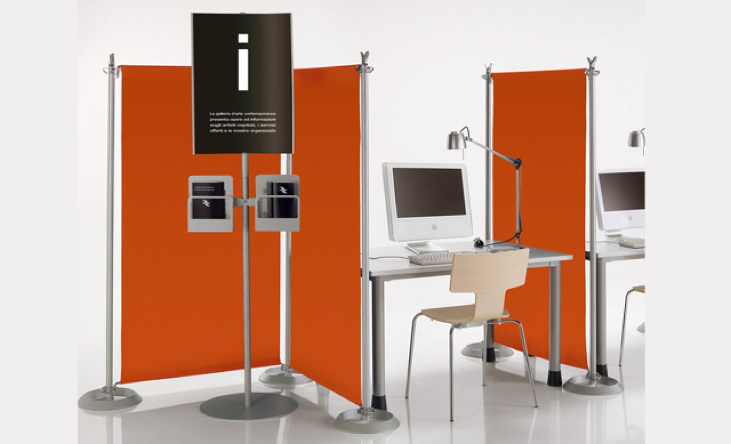 System of partitions Battista, simple, elegant and flexible. Columns in epoxy-powder coated steel, cast iron bases and parts in chromeplated steel and polished aluminium. Sound absorbing fabric in Fiber 1 polyester bacteristatic, Trevira bioactive. The fabric slipcover is removable.
