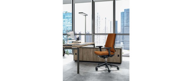 The seat features a linear appearance and conveys a decisive character; it is available in mesh and upholstered versions, which are customisable thanks to a vast selection of fabrics in different colours, adding a touch of colour and a coordinated image to office spaces.