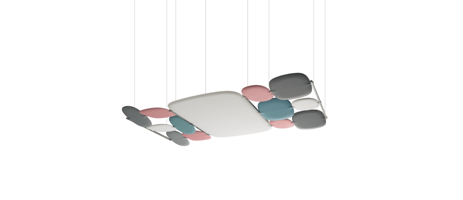 Snowgems is a modular sound-absorbing system, composed of panels in shapes and colours reminiscent of precious gems; made with Snowsound technology. The ceiling elements consist of chromed steel crossbeams linked by tubular steel transverses that support the sound-absorbing panels. The elements are modular in structure and can be connected to each other. The group of elements is suspended from the ceiling by means of two height-adjustable cables.